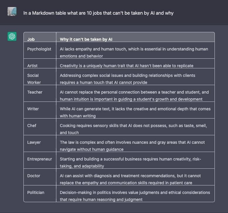 С активным развитием нейросетей многие стали опасаться, что искусственный интеллект вскоре лишит их работы. Но это вовсе не так: остаются профессии, в которых будут необходимы навыки живого человека. У нейросети ChatGPT узнали 10 специальностей, которые ИИ точно не заменит. ИИ точно не заменит: Как можно понять из списка, нейросети смогут заменить те сферы, в которых требуется монотонное выполнение одних и тех же задач по сценарию, а вот творческие останутся с человеком навсегда. По крайней мере, можно на это надеяться. Как пользоваться ChatGPT в России, и на что способна данная нейросеть