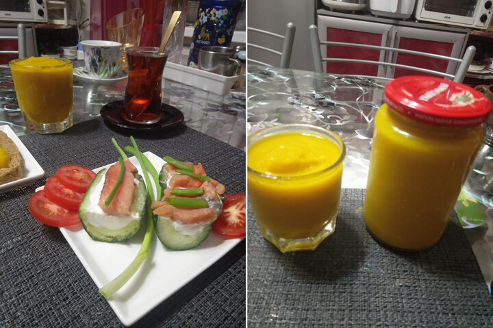 Я сегодня с хорошей новостью для тех, кто не может без сладкого. Теперь вы сможете пить чай с красивым, ароматным, вкусным и очень полезным джемом! Итак, сегодня на завтрак только полезные и красивые «вкусняшки»! ✓ «Самые ленивые» роллы! Берём один длинный свежий огурец. Разрезаем его пополам, вычищаем серединку с семенами - получаются «лодочки». И заполняем серединку творожным сыром или творогом, или сыром маскарпоне. Равняем края ножом, слегка подсаливаем, перчим, разрезаем на кусочки, и сверху выкладываем кусочки слабосолёной рыбки - форели, сёмги, селедки. И украшаем веточкой укропа и перышком зелёного лука. Красиво и вкусно! ✓ А к чаю - тыдым... Лимонный джем! Ох, какой вкус, какой аромат, какое послевкусие... Райское наслаждение! Готовится очень быстро, и съедается так же. Берём три свежих кабачка, моем. Чистить от кожицы не надо. Режем произвольно кубиком, укладываем в сотейник. Затем счищаем с двух крупных лимонов цедру и добавляем к кабачкам. Очищаем лимоны от белой кожуры и д
