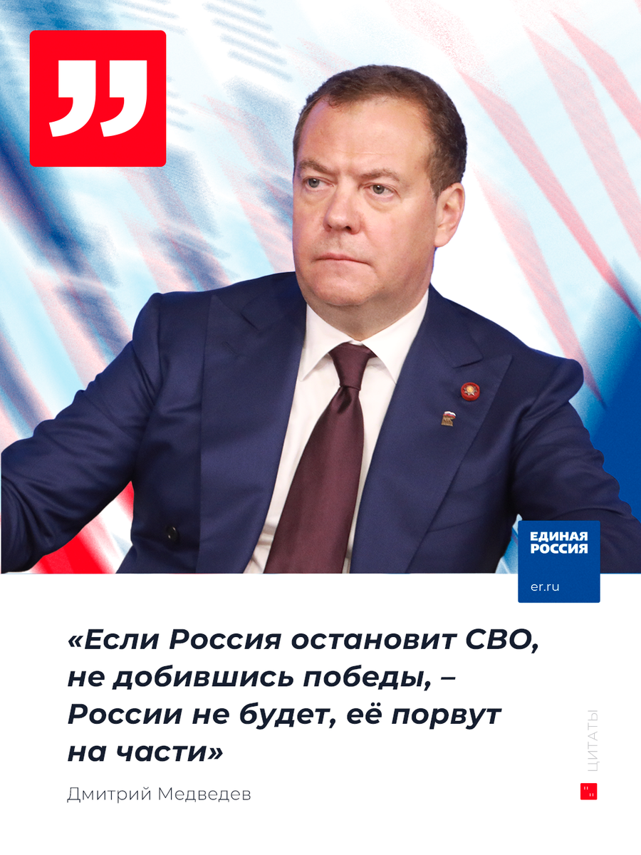 Если Россия остановит СВО, не добившись победы, – России не будет, её порвут на части. Если США перестанут поставлять оружие киевскому режиму – война закончится», — написал в своем телеграм-канале Дмитрий Медведев