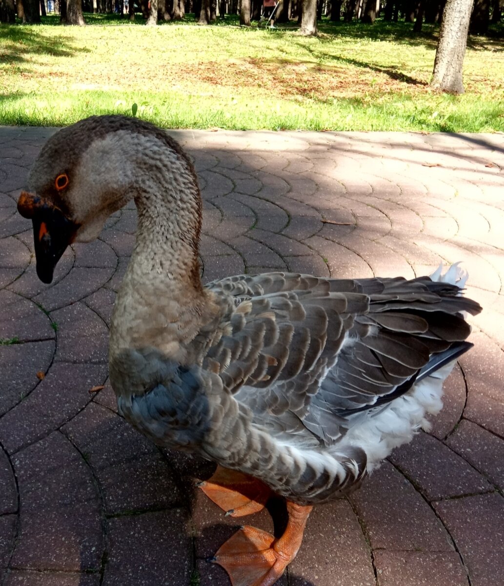 Домашний Гусь гуляющий в минском парке Челюскинцев. Что же интересного в этой птице? Кажется, все видели этих неуклюжих с виду водоплавающих пернатых. Меня заинтересовал внешний вид этого Гуся. Дело в том, что большая часть признаков говорит о Китайской породе Домашних Гусей. В пользу этого рассказывает его внешний вид - шишка над клювом ( размер её говорит о том, что перед нами самка) и тёмный ремень от клюва, через голову и по всей длине шеи . Но у птицы отсутствуют еще два ярких признака - белая шея под ремнем и белая полоска у основания клюва. И это говорит, что перед нами гибрид. Скорее всего Переяславской или Кубанской породы, ведь кроме генов Kb и Ns отвечающих за шишку и полоску, у него есть ген Di , который добавил складку-кармашек за клювом. Китайская порода появилась от одомашненного дикого Гуся-Сухоноса, обитающего в Северном Китае и Сибири. Домашняя форма не только изменила окраску ( появились два вида - Серый и Белый))), но и размер птиц. Домашние гуси значительно кр