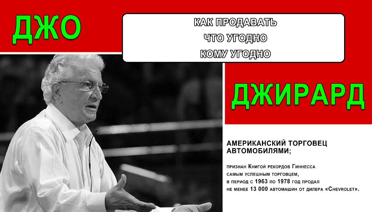 Джо Джирард - Американский торговец автомобилями; признан Книгой рекордов Гиннесса самым успешным торговцем, в период с 1963 по 1978 год продал не менее 13 000 автомашин от дилера «Chevrolet». Его советы и «секрет успеха» опубликованы в его книге «Как продать что угодно кому угодно», с которой Вы сегодня познакомитесь. Основные моменты книги: 👉 Глава 1.