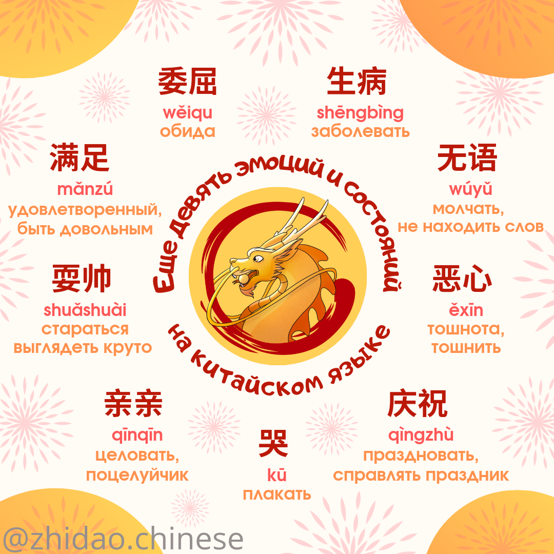 #zhidao_способы_сказать💭 Сегодня делимся с вами еще девятью эмоциями и состояниями на китайском языке! 🧐 1️⃣ 委屈 wěiqu обида 2️⃣ 生病 shēngbìng заболевать 3️⃣ 无语 wúyǔ молчать, не находить слов 4️⃣ 恶心 ěxīn тошнота, тошнить 5️⃣ 庆祝 qìngzhù праздновать, справлять праздник 6️⃣ 哭 kū плакать 7️⃣ 亲亲 qīnqīn целовать, поцелуйчик 8️⃣ 耍帅 shuǎshuài стараться выглядеть круто 9️⃣ 满足 mǎnzú быть довольным 📝 Ссылка на карточки Quizlet для изучения новых слов: https://quizlet.com/_cubuzg?x=1qqt&i=2r5snr ❗В Quizlet вы можете послушать произношение всех фраз! Для этого нажмите на значок микрофона 🔊 📚 Хотите, чтобы Вы или Ваш ребенок заговорили на китайском? Напишите нам для записи на групповые / индивидуальные занятия! 🎓 #china #chinese #школакитайского #китайский #москва #язык #китайскиймосква #учукитайский