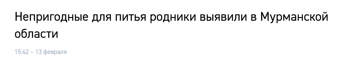 Родники Мурманской области оказались непригодны для питья — такая информация распространяется в СМИ. Это показал анализ воды и почвы в местных родниках провели во время уборки. Об этом сообщил член федерального штаба проекта «Чистая Арктика». В Минприроды Мурманской области опровергли эту информацию. «Обращаем ваше внимание, что ранее публиковалась искажённая информация о состоянии воды в родниках Мурманской области», — сообщили в министерстве. Учёные Кольского научного центра провели исследование 24 родников Мурманской области, активно используемых населением в питьевых целях. Результаты химического анализа показали, что более половины исследованных источников были питьевыми и соответствовали воде первой категории по российским гигиеническим нормативам. Для исследования были отобраны десять самых популярных родников, таких, как «Горный», «Лапландский», «Каменный» и другие. В основном, по исследованным показателям в воде родников превышений предельно допустимых концентраций не выявлено