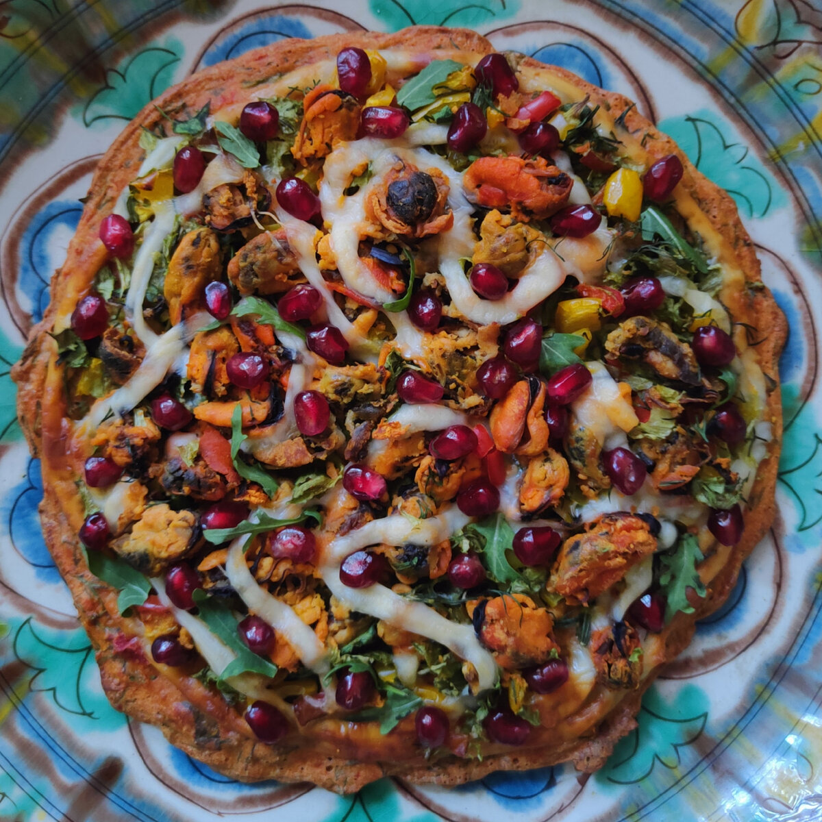 Приветствую вас! Сегодня Разгуляй, или Широкий четверг, начинается Широкая Масленица. Все домашние работы прекращались, народ шел веселиться и есть блины. Мы тоже не будем нарушать традиции. Впереди длинные выходные, надеюсь, у каждого программа активного отдыха уже составлена. А в качестве блинов у нас сегодня пицца с мидиями (день то рыбный!). Тесто: 1 яйцо С0, 4 средних очищеных помидора в собственном соку(я покупаю в Пятёрочке, "Красная цена", мне нравятся))), по 2 ст.ложки овсяной и нутовой муки, шпинат и укроп, 1/2 ч.ложки разрыхлителя. Начинка: 200 г мяса мидий, немного болгарского перца, шпинат, укроп, несколько полосок сыра "косичка". Яйцо взбить, помидоры мелко порезать, раздавить, лишний сок слить , смешать с яйцом, добавить муку, разрыхлитель, мелкопорезанную зелень, все хорошо размешать. Выложить тесто кругом на разогретую сухую сковороду и поджарить с одной стороны. Выложить в форму для запекания поджаренной стороной вниз. Сверху выложить начинку - слой зелени с мелконар
