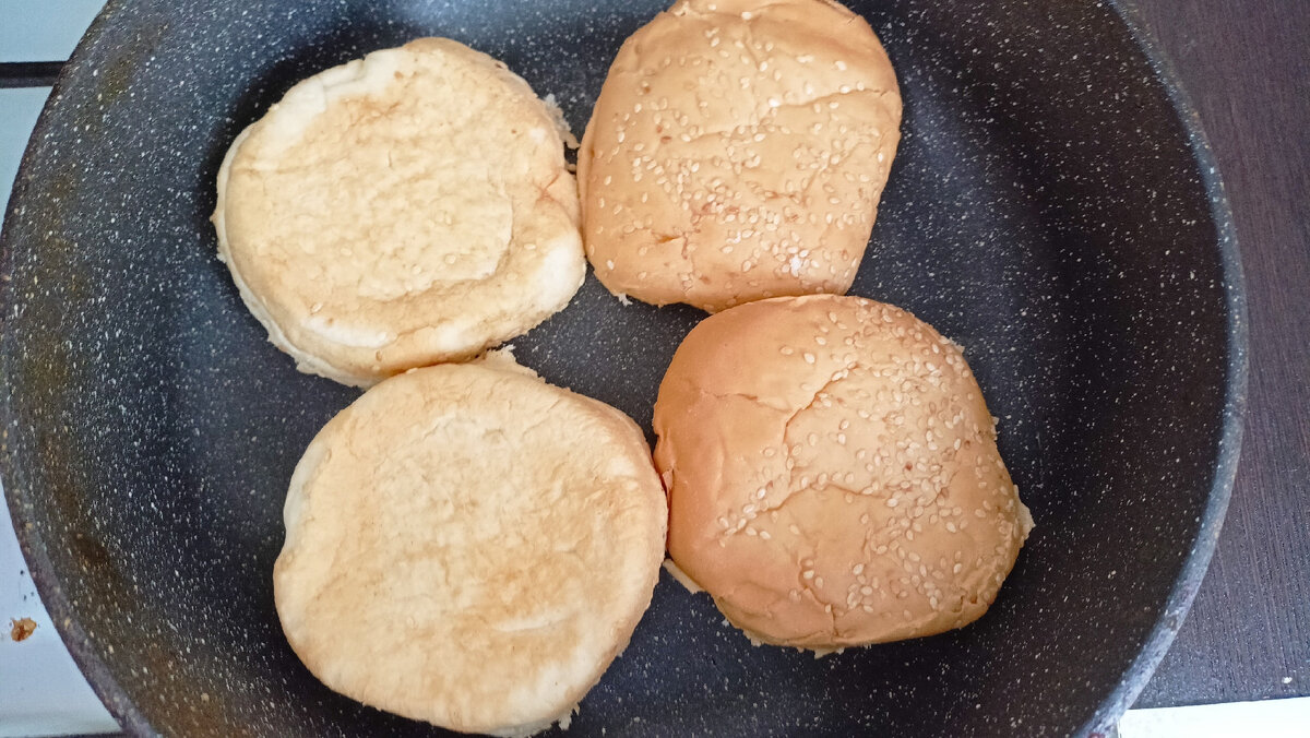 Приветствую, друзья! Сегодня покажу один из самых простых способов приготовить сочный и вкусный бургер дома. Такой бургер не размокнет и не распадётся, а также наверняка порадует вас ярким насыщенным вкусом. Время приготовления - 15 минут. Сложность - низкая. Итак, ингредиенты! 1. Подсушиваем булочки Чтобы бургер не размок и не отсырел, разрезаем булочки на половинки и подсушиваем внутренние стороны на гриле или очень хорошо раскалённой сковороде. 2. Смазываем горчицей Нижние половинки булочек смазываем горчицей. Ориентируйтесь по тому, насколько вы любите остроту. Вообще ингредиентов в бургере много, так что можно мазать посмелее. Острота перекроется обилием других вкусов. 3. Жарим котлеты Поджариваем котлетки из любого фарша до румяной корочки. В моём случае это курино-свиной фарш, который я делаю сам. Жарю на гриле, но вполне можно и на сковородке. К слову, друзья, всем рекомендую обзавестись электромясорубкой и делать фарш самостоятельно. Магазинский с самодельным даже примерно