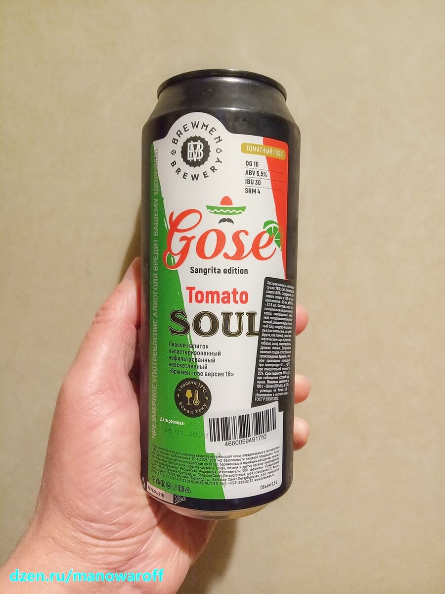 Любители томаток сразу заподозрили, что у нас сегодня будет обзор очередного напитка из линейки Tomato Soul, которую варит новгородская пивоварня Brewmen. И таки да, мы будем пробовать последнюю на данный момент томатную гозешку под названием Tomato Soul Sangrita Edition. Название намекает, что у нас сегодня будет мексиканщина. Попробуем. Первая партия этого пива появилась на свет в декабре прошлого года. А у меня баночка посвежее будет - от 24 января. Прям к моей Днюхе разлили. Ну а выпил я сей пивас немногим менее месяца спустя. Состав достаточно богатый. Кроме того, что положено, в пивандрий добавили следующие ингредиенты: ТТХ: Хотел было налить пиво в мой обычный стакан для томаток, но заметил на банке рекомендацию. Ладно, нальем в рекомендованный бокал. Пиво мутное, непрозрачное. Пены нет. Пахнет помидорами и цитрусами, в частности лаймом. Во вкусе апельсин с грейпфрутом, лаймовая кислота, специи и на заднем плане помидоры. В послевкусии поначалу все то же самое, но потом на первы
