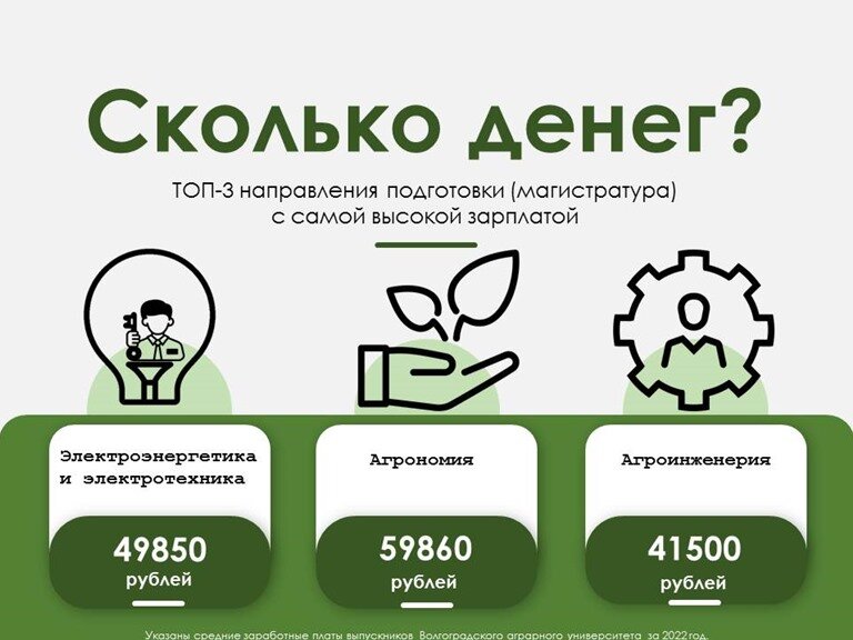 Центр карьеры проанализировал заработные платы выпускников ВолГАУ трудоустроившихся в 2022 году. В результате определился ТОП-3 направлений подготовки (магистратура) с самой высокой зарплатой: Агрономия – 59 863 рублей; Электроэнергетика и электротехника –49 858 рублей; Агроинженерия – 41 521 рублей. В целом зафиксирован большой спрос на агрономов – по сравнению с 2021 годом, средний уровень зарплаты в данной сфере деятельности значительно вырос, в 2023 году этот тренд сохранится. Основной рост произошел после апреля 2021 год по нескольким причинам: (https://agrotrend.ru/news/25579-dorogie-kadry-obzor-zarplatnyh-ozhidaniy-agronomov) За экспертным мнением специалисты Центра карьеры обратились к заместителю главы представительства АО Фирма «Август» г. Волгоград Николаю Сергеевичу Талдыкину. АО Фирма «Август» – крупнейшая российская компания по разработке, производству и информационно-технологическому сопровождению применения химических средств защиты растений. «Август» входит в рейтинг Р