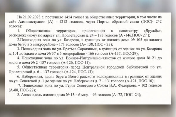 Добавим, что список составлен по мере убывания количества голосов (см скриншот документа). То есть в принципе уже можно примерно определить будущие территории. Например, территория «у Дружбы» набрала 177 голосов. Улица Братьев Сорокиных — 166 голосов, а Воинов-Интернационалистов — 137. Результат остальных — менее 133. Например, территории в 6 микрорайоне оказались на последних местах, и попадут ли они в итоговый список работ после дальнейшего голосования — вопрос.