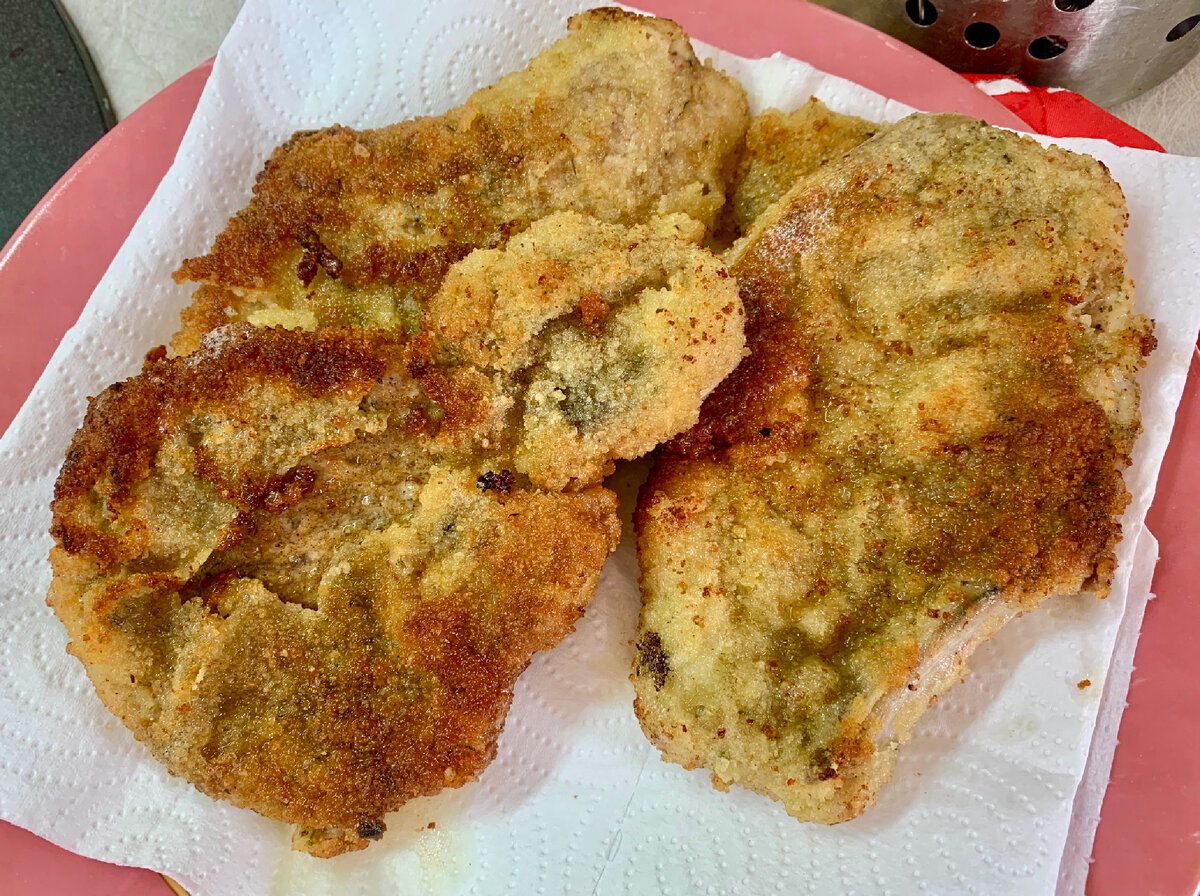 Для приготовления понадобятся: В отдельные тарелки необходимо выложить муку, панировочные сухари и яйца. На этом этапе я яйца взбиваю вилкой и добавляю небольшое количество соли, перца, приправы. Свиные стейки необходимо отбить молотком с каждой стороны и хорошенько втереть соль, перец, специи. Затем поочередно обваливаем стейки в муке, затем в яйце и в панировочных сухарях и отправляем на сковородку с хорошо раскаленным растительным маслом. Обжариваем с двух сторон до золотистой корочки. После шницели можно выложить на бумажное полотенце, оно впитает в себя лишнее масло. Готово 👌 Приятного аппетита!