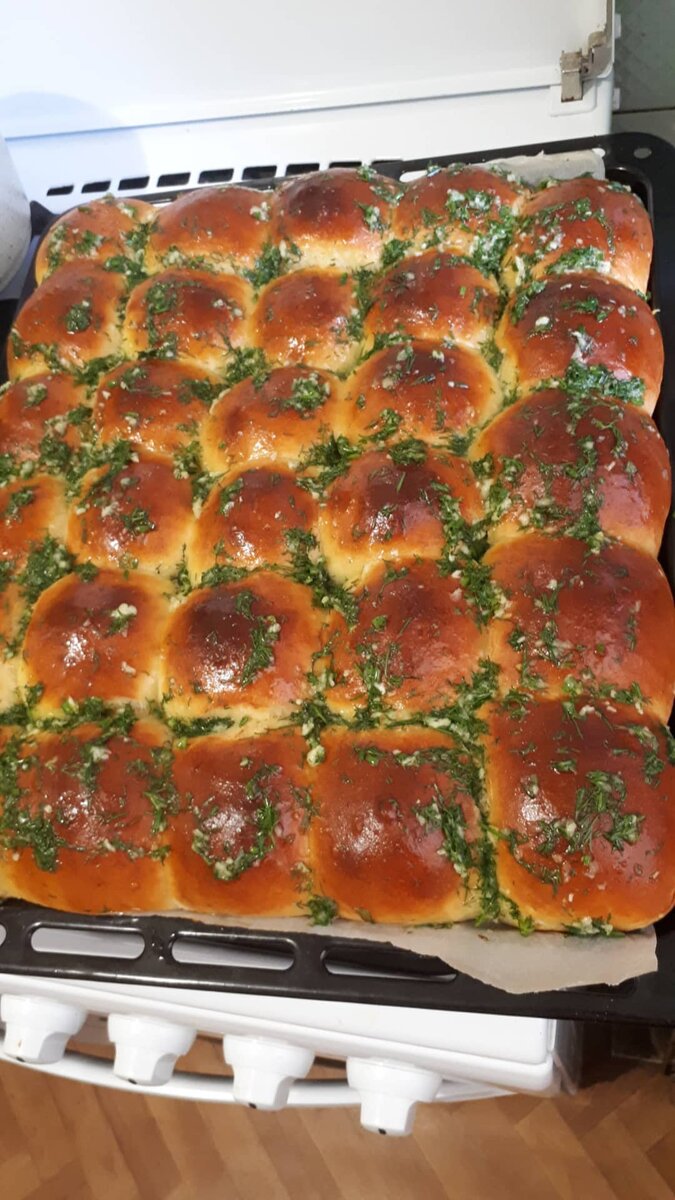 РЕЦЕПТ очень простой,я делаю только так,это универсальное дрожжевое тесто из старой поваренной книги.Его можно как печь,так и на сковороде жарить ,получается очень вкусно и так и так 0.5 литра молока 3ст.ложки сахара 0,5 ч.ложки соли 1ст.ложка растительного масла 50г растопленного маргарина 1.ст.ложка сухих дрожжей(либо 50г живых) 1 литровая банка муки В кастрюле я растапливаю маргарин,затем наливаю молоко,подогреваю,насыпаю соль,сахар,перемешиваю,добавляю растительное масло и просиеиваю муку с дрожжами постепенно,тесто будет липнуть к рукам,но муки добавлять не советую,вымешиваем хорошо и ставим подходить,обминаем два раза,на третий раз разделываем тесто,формируем шарики ,и даём ещё раз подойти,смазываем яйцом и ставим в разогретую до 180° духовку и выпекаем минут 25-30(у меня уходит на режиме верх ,низ), у Вас может дольше,смотрим по красивой румяной верхушке.После выпечки смазываем пампушки смесью чеснока ,укропа,соли и масла растительного. Приятного Вам аппетита🤗🤗🤗