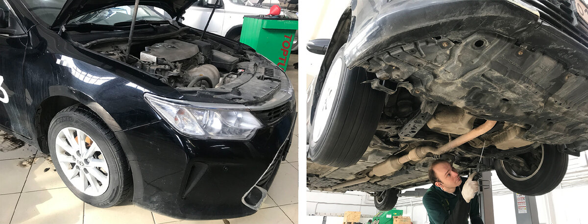 Защита картера двигателя и трансмиссии. Поступали обращения - «гудит коробка, особенно когда назад сдаёшь». Автомобиль на подъёмник. Двигатель пускаем, селектор в R. Ну и понятно сразу становится - защита днища, имея изначально минимальный зазор с трубой выхлопа, при подаче нагрузки на силовой агрегат, зазор этот утрачивает. Выхлопная труба начинает барабанить по защите - вот и заявленный гул! А дело всё в некорректном монтаже защиты картера.