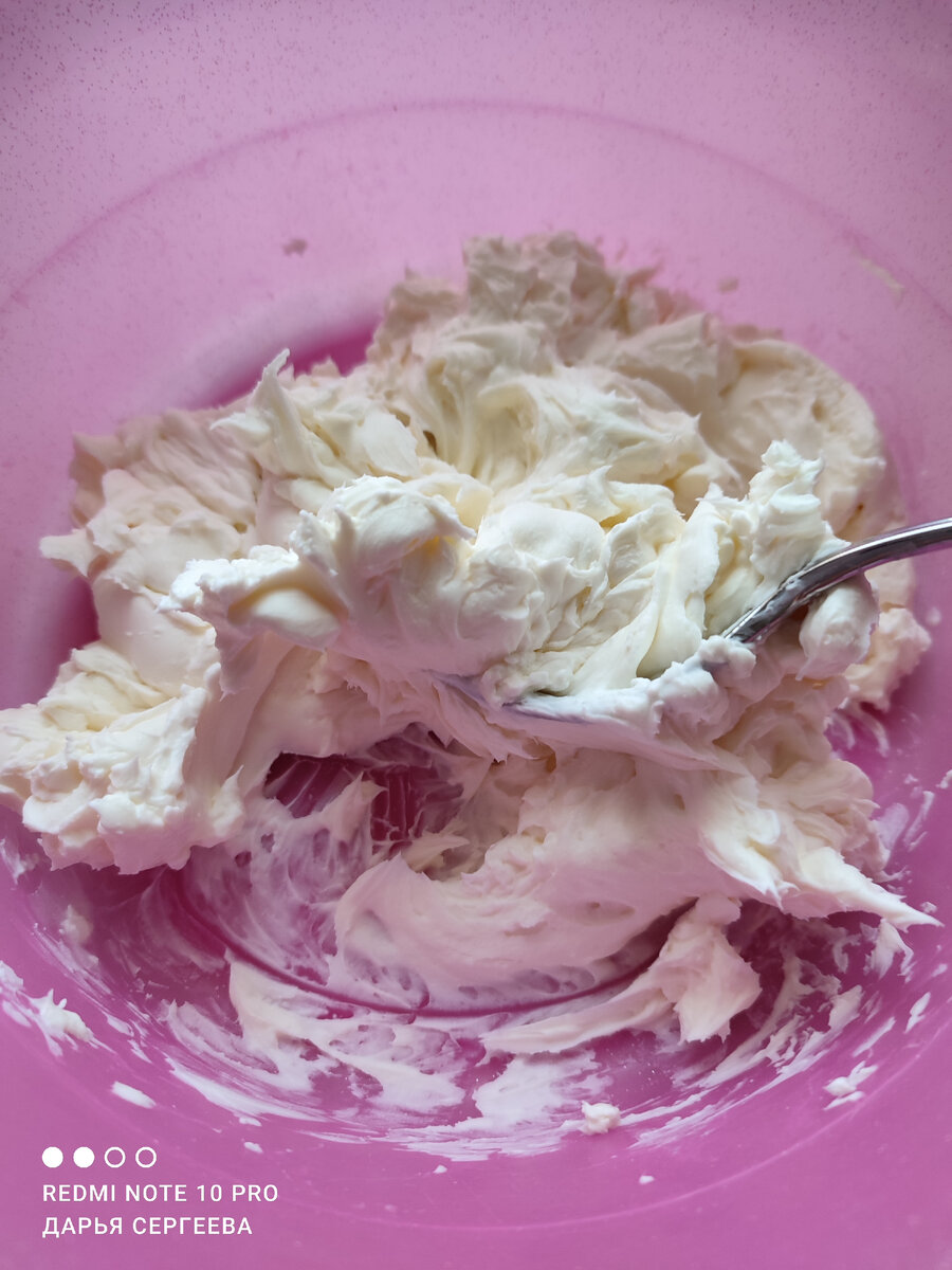 Смешиваем сливки в миске с сыром. По возможности, не лупим по сливкам лопаткой, а вымешиваем снизу вверх. Чтобы крем остался кремом, а не стал пастой)