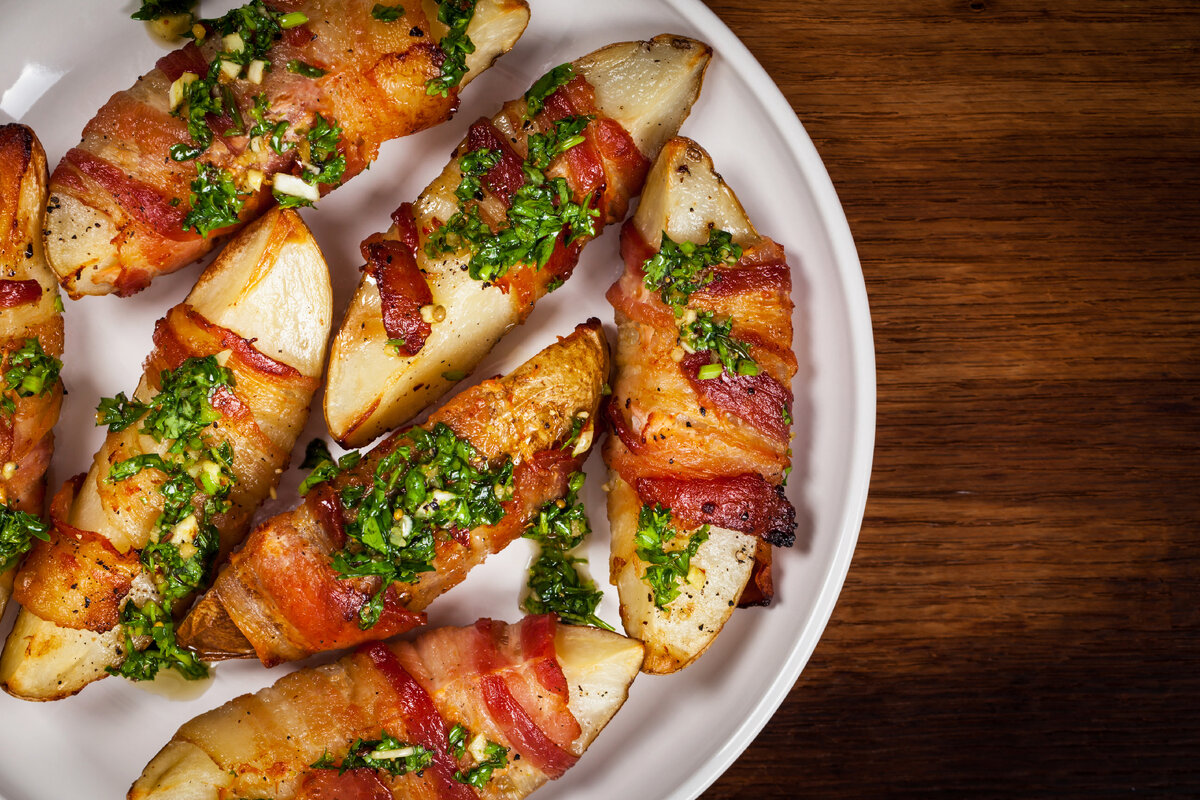 - завернуть бекон вокруг картошки, чтобы получился рулетик