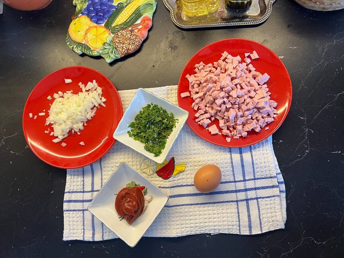 Здравствуйте, уважаемые читатели! Сегодня я к вам с любимым рецептом нашей семьи и друзей. Он был найден в одном из старых журналов моей мамой, записан навечно в ее тетрадке и я его теперь готовлю на глаз, без особых пропорций. Подумаешь, бутерброд! Но есть маленькие тонкости, которые превращают его в маленький шедевр. Одним не обходится никогда. На праздничном столе он не остается. Его всегда мало. Заинтересовала? Для начала нужно приготовить бутербродную массу. Это можно сделать заранее за день-два до праздника, она прекрасно хранится в холодильнике. Понадобится небольшая луковица, нарезанная очень мелко, половина батончика (грамм 200-300) вареной колбасы, маленькими кубиками, чем меньше, тем лучше, 1-2 ст. ложки томатной пасты, зелень петрушки и одно сырое яйцо. В сковороду наливаем 2 ст. ложки растительного масла, обжариваем лук на маленьком огне до мягкого состояния 5-7 минут, затем добавляем колбасу, перемешиваем, даем немного потомиться в луке и добавляем томатную пасту, 0,5
