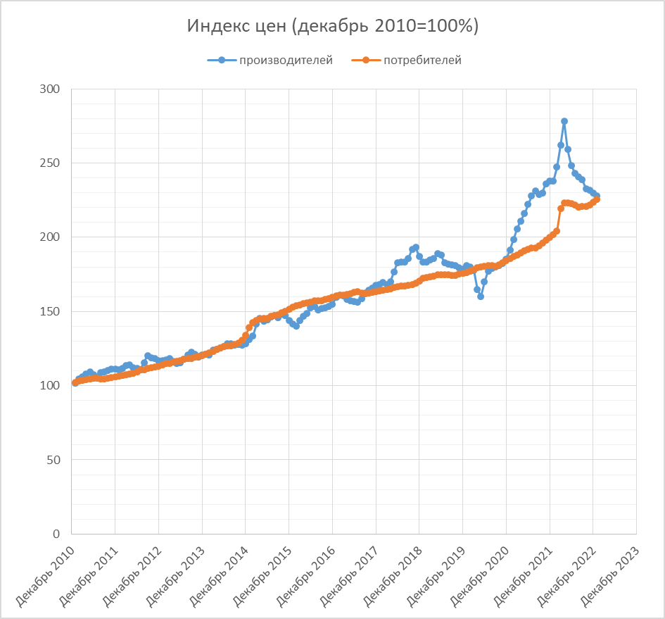 Собственно, Росстат выпустил по ним данные. Продолжается небольшая дефляция. Из-за этого разрыв с потребительскими ценами практически исчез. В лидерах по дефляции ожидаемо попавшая под евросанкции нефть (по ней и добыча снизилась на 1% к прошлому январю), ну и нефтепродукты, по ним санкции с начала февраля, но, видимо, уже в январе готовились (до этого такая же картина была по другим санкционным товарам, углю, например). Интересно, что значительно подорожала электроэнергия.