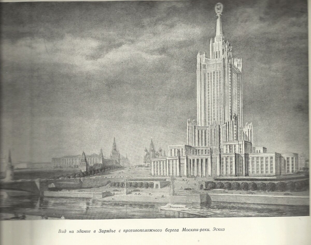 13 января 1947 года Совет министров СССР принял постановление «О строительстве в Москве многоэтажных зданий», в котором описаны планы по возведению восьми московских высоток. Одним из пунктов документа значилось сооружение 26-этажного административного здания в Зарядье, «на месте предполагавшегося к строительству Дома Cовнаркома». Административное здание должно было на визуальном уровне «поддерживать» Дворец Советов и связать в единый ансамбль другие московские высотные здания. Грандиозный проект возведения Дворца Советов на месте взорванного в 1931 году Храма Христа Спасителя так и не был реализован.