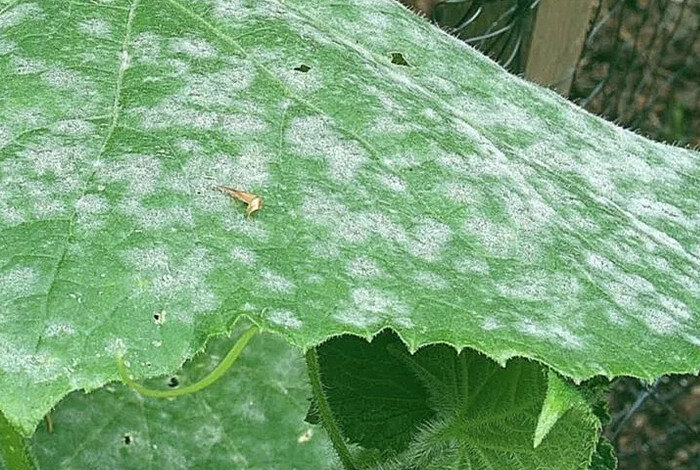 1. Белый налет на листьях говорит о грибковом заболевании – мучнистая роса. Болезнь поражает листья и плоды. Споры грибка вызывающие мучнистую росу активно размножаются в дождливую погоду. И, наоборот, жаркая погода помогает бороться с заболеванием. Посмотрите на фото листьев, пораженных болезнью.