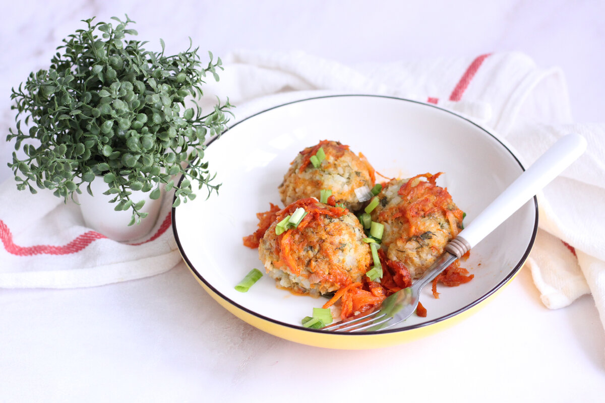 Получается не менее вкусно, а по мне так даже вкуснее. Фарш соединить с рисом, добавить измельченную зелень и натертый на крупной терке кабачок. Посолить и поперчить по вкусу. Сформировать небольшие тефтели и выложить на смазанную растительным маслом форму. Запекать 20 минут при 180 градусах. Морковь натереть на крупной терке, лук мелко порезать. Обжарить на растительном масле. Добавить томатную пасту, соль и перец. Влить немного воды и тушить 10 минут. Овощи выложить сверху на тефтели, влить еще немного воды. Запекать еще 20 минут. Фарш лучше использовать из белой рыбы.