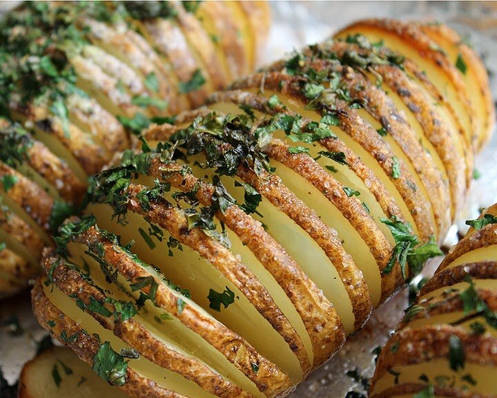 ИНГРЕДИЕНТЫ: 750гр мелкого картофеля 3-4 столовые ложки оливкового масла 1 зубчик чеснока Свежий розмарин (или сушеный) Свежий тимьян (или сушеный) рупная морская соль Хлопья чили, необязательно 1 чайная ложка цедры лимона, необязательно ПРИГОТОВЛЕНИЕ: 1. Разогреть духовку до 180 градусов. 2.Сделать надрезы по 2-3мм в каждом клубне, оставляя около 1см от противоположного края. 3.Смазать клубни полностью маслом и запекать 20-30 минут. 4. Тем временем приготовить масло с зеленью. Натереть чеснок, порубить мелко розмарин и тимьян и смешать все с маслом. 5. Через 20-30 минут вынуть картофель, полить маслом с зеленью и убрать в духовку еще на 10 минут. 6. Вынуть из духовки, когда верхушки будут достаточно румяными. Приправить солью с перцем, цедрой лимона и остатками зелени по желанию. Приятного аппетита!