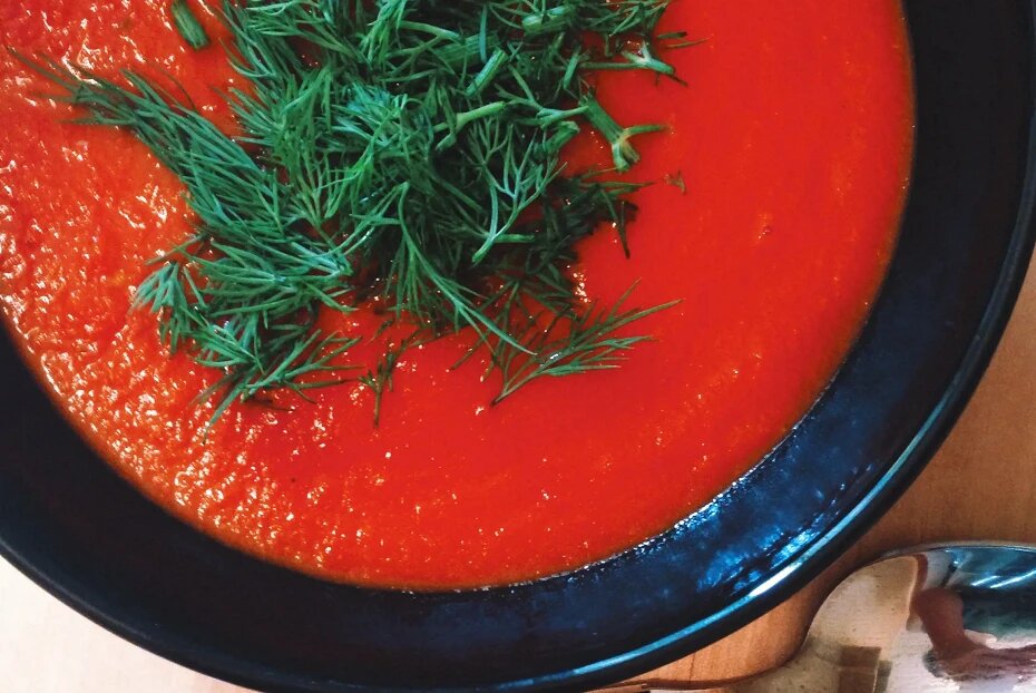 Суп должен получится слегка с кислинкой. Это зависит от сорта помидоров. Если вам не достаточно кислинки, модно добавить уксус или лимонный сок. 1.Почистить лук, нарезать мелкими кубиками. Почистить морковь, натереть на крупную терку. Жарить на сковороде. Когда добавить мелко нарезанный большой зубчик чеснока. 2.Переложить недожаренный лук, морковь и чеснок из сковороды в кастрюлю. Порезать болгарский красный перец кубиками и выложить в ту же кастрюлю. Начать тушить. 3.Добавить нарезанный кубиками помидор, тушить. Затем развести томатную пасту водой и добавить щепотку сухого орегано. Продолжать варить еще 5 мин с лавровым листом. 4.Убрать лавровый лист. Измельчить суп в крем с помощью блендера. Посолить, поперчить красным перцем по вкусу. Добавить мелко нарезанные листья петрушки. Любите читать Дзен «Еды»? Расскажите свое мнение о материале в комментариях и ставьте свои лайки!