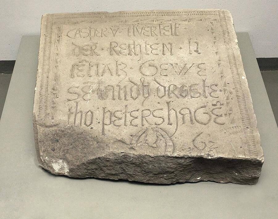 Here you can see a large stone tile. This is a tombstone with the name of Caspar von Elferfeldt. It’s in German. It's hard to imagine, but this tombstone dates back to 1571. It was discovered only in 1989, in the oldest cemetery outside the city. At the moment, this is the only medieval tombstone that depicts a portrait of the deceased.