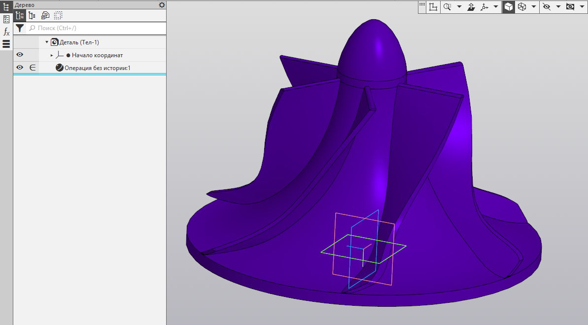В данном цикле уроков осуществим реверс-инжиниринг скачанной модели турбины в формате Step. Аналогичные действия можно использовать для формата Iges, Sat, x_t – т.е любых обменных САПР форматом, содержащих NURBS поверхности. Для фасетных форматов, как Stl, это не совсем подходит, т.к ряд используемых операций не применим для полигональных поверхностей. В этом уроке мы создадим опорную геометрию, на основе которой можно воссоздать модель, чтобы была возможность провести небольшую модификацию. Мы открыли модель турбины и видим операцию без истории. Ничего сделать с ней невозможно. Нельзя изменить форму вала турбины, нельзя изменить количество лопастей и т. д. Вал Для начала уберем лишние лопасти. Нам на данном этапе достаточно всего одной. Открываем набор «Каркас и поверхности». Запускаем команду «Удалить грани». Удаляем все грани лопастей, оставляем только одну лопасть. Проще всего выделить рамкой всю модель, после чего прощелкать грани, которые удалять не нужно. Не забудьте отключить