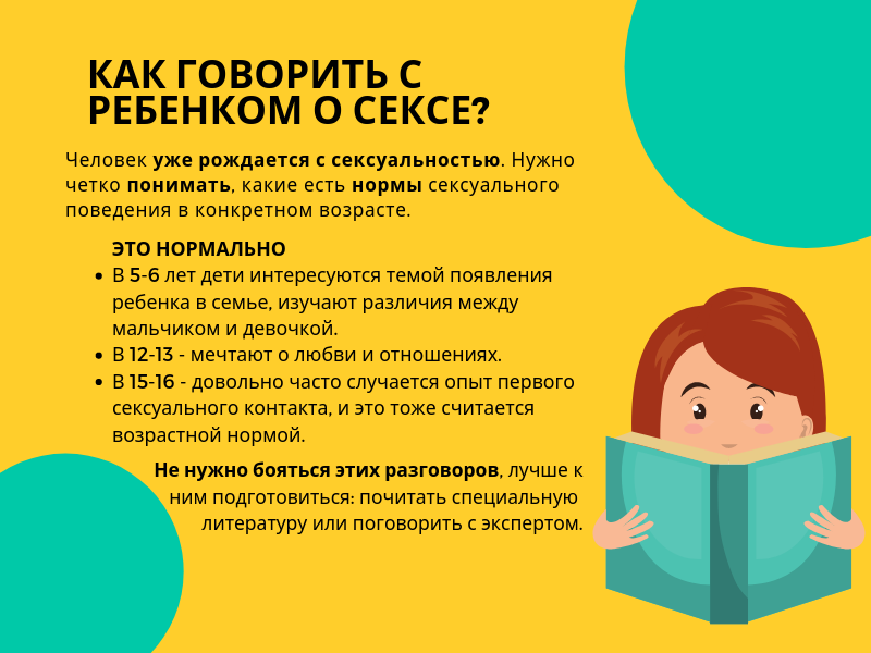 «В каком возрасте нужно говорить с ребенком о половом созревании?» Ответ : «Рекомендуется начинать говорить с ребенком о половом созревании примерно в возрасте 10 или 11 лет. Однако важно знать об индивидуальном развитии вашего ребенка и начинать разговор, когда он будет готов.» Как ответить ребенку на вопрос «что такое секс?» Объяснение секса вашему ребенку может быть трудным, но важным разговором. Во-первых, важно помнить, что то, как вы объясните секс, будет зависеть от возраста и уровня зрелости вашего ребенка. Для очень маленьких детей вы можете сосредоточиться на основах: секс — это способ, которым взрослые проявляют любовь и заводят детей. Когда они станут старше, вы сможете предоставить более подробную информацию. Объясняя секс своему ребенку, важно быть открытым и честным. Вы можете начать с объяснения того, что секс — это естественная часть жизни, и что это то, что взрослые делают, когда любят друг друга и заботятся друг о друге. Вы можете объяснить, что это предполагае