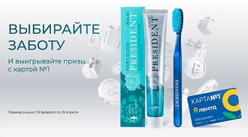 Подробнее https://reklamnyeigry.ru/2023/02/22/president-%d0%b2%d1%8b%d0%b1%d0%b8%d1%80%d0%b0%d0%b9%d1%82%d0%b5-%d0%b7%d0%b0%d0%b1%d0%be%d1%82%d1%83/ Чтобы принять участие в рекламной акции PresiDENT – Выбирайте заботу необходимо с 15 февраля по 18 апреля 2023 года: 1. В сети магазинов Лента купить любые продукты бренда PresiDENT с картой №1; 2. зарегистрировать чек на сайте акции https://promo.presi-dent.ru/ и получить гарантированный кешбэк 10%; 3. Участвуйте в еженедельном розыгрыше призов, баллами на Карту №1 Призовой фонд: