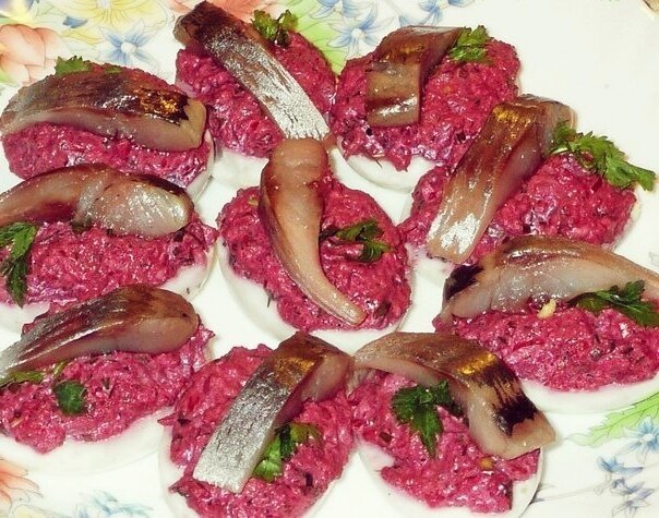 Всем привет. Обычная селёдка под шубой делается в общей тарелке, но я переиграла ситуацию. Ингредиенты: Яйца - 4 шт. Свекла - 2-3 шт. Лук - 1 шт. Селедка - 1 шт. Майонез - 200 г. Чеснок - 2-3 зубчика. Зелень - укроп, петрушка. Соль - по вкусу. Способ приготовления Отвариваю свеклу, яйца, остужаю, очищаю. Яйца разрезаю пополам, отделяю белки от желтков. Свеклу натераю на крупной терке. Желтки разминаю вилкой, мелко режу лук и половину селедки. Все это перемешиваю до однородной массы, солю, можно добавить перца чёрного. Далее добавляю майонез, измельчаю чеснок и кладу мелко нарезанный зелени и еще раз перемешиваю. Фарширую полученной массой половинки яичного белка, ленивая шуба готова. Сверхукладу кусочки селедки. Украшают зеленью. И вуаля. Селёдка под шубов в виде бутеров готова. Как вам такая подача?????