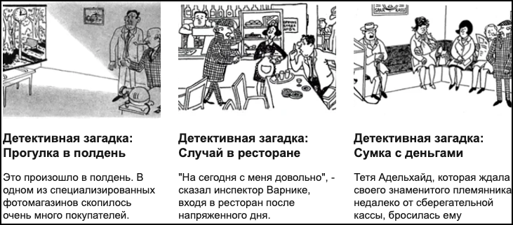 Кто-то, наверное, помнит, что в 60-70-х годах прошлого века журнал "Наука и жизнь" познакомил своих читателей с инспектором Варнике, персонажем восточногерманского журнала "Ойленшпигель", инспектор ходил в клетчатой одежде и с курительной трубкой. Криминальная история состояла всего из одного рисунка, внимательно приглядевшись к которому, можно было вместе со следователем Варнеке найти виновного в том или ином преступлении. Обычно в самом рисунке и содержался ответ.
