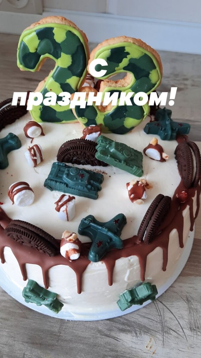Выставила в группе и сразу поступил заказ на этот торт. Просили на вечер. Я согласилась на похожий , без цифр, но с танками и прослойка будет ягодная и крем чиз на сливках. Думаю будет вкусно?! Фото торта в следующей раз покажу.