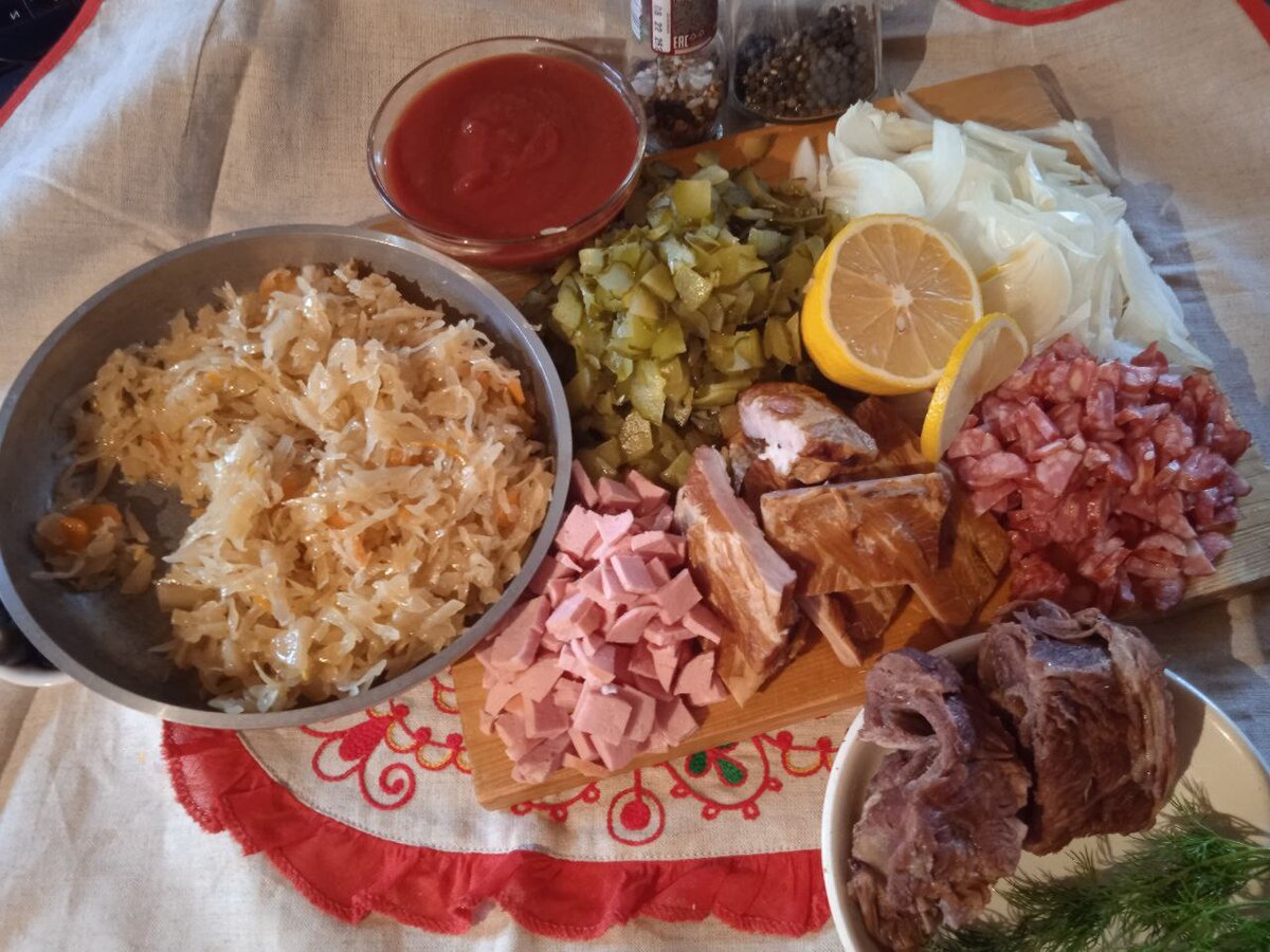Всем добра и здравия! Сегодня продолжаем готовить солянки, но это уже будет не суп, но тоже солянка, но солянка не только с солеными огурцами и мясным набором, а еще и с капустой. Солянка сборная на сковороде, относится к горячим закускам, однако не редко его подают, как второе горячее блюдо. В повседневной жизни, в повседневном питании, полагаю мало кто, готовит и подаёт горячие закуски. Исходя из этого, солянка сборная на сковороде, будет отличным горячим блюдом. Забегая вперед, скажу, что готовить её можно на много порционной сковороде, а затем подавать, разложив на тарелки. Готовим солянку сборную на сковороде. Солянка сборная на сковороде Рецептура 684 Вес мясного набора 100-125 г Вес тушеной капусты – 150 г Вес припущенных огурцов – 30-33 Вес соуса томатного – 50 г Вес Солянки п/ф (до запекания) – 330-350 г Вес запеченной солянки 270-285 г Для подачи: Приготовление Мясные компоненты нарезают ломтиком или средним кубиком, слегка обжаривают . Соленые огурцы нарезают ломтиком или с