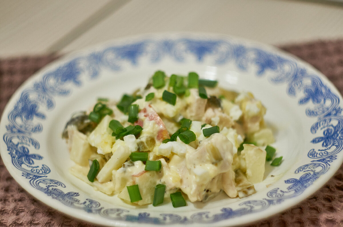 Привет. Сейчас у нас масленичная неделя и хоть я предлагаю вам не рецепт блинов. Но, думаю в такие выходные вы захотите собраться всей семьей и посидеть с друзьями. Предлагаю вашему внимаю очень вкусный и простой деликатесный салат на скорую руку. Салат настолько простой, что для его приготовления будем использовать только нож. Никаких терок и других измельчителей. Приветствую всех читателей моего блога! Меня зовут Вера, и я очень рада видеть Вас на своем кулинарном канале. Подготовка: Заранее необходимо отварить и остудить яйца, курицу. Приготовление: Мелко нарезаем яйца и отправляем в салатник. Количество ингредиентов, вы найдете в конце статьи. Добавляю одно среднее яблоко. По желанию, можно снять кожуру. Но, мне кажется, что с ней получается вкуснее. Яблочко может быть любое, от красного до зеленого. От кислого, до сладкого. Маринованный огурец нарезаю кубиками и также выкладываю к другим ингредиентам. Куриное филе, а лучше взять филе индейки. Разделить на небольшие волокна