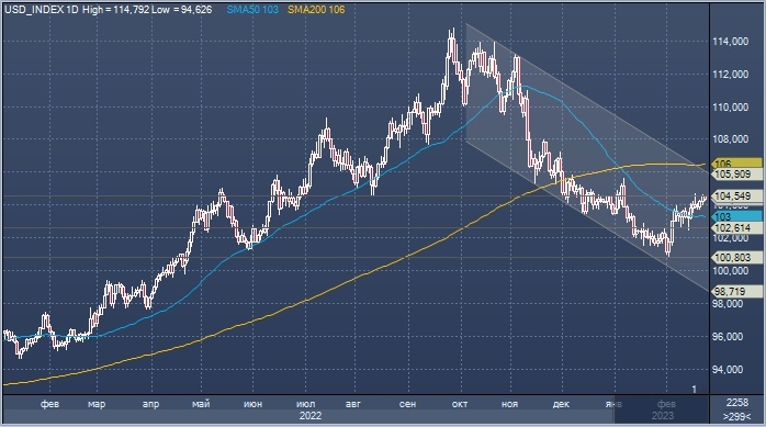 Казначейские облигации не торговались в Азии из-за праздника в Японии. График индекса доллара интервалами в 1 день Доллар в среду закрылся на самом высоком уровне с 6 января (индекс доллара), но демонстрирует снижение в четверг, так как рынки смирились с идеей, что Федеральная резервная система, вероятно, не сойдет с пути агрессивного повышения ставок, после того как опубликованный накануне протокол февральского заседания Комитета по открытым рынка отразил повышение ястребиного настроя чиновников Федрезерва. Почти все чиновники ФРС высказались за снижение темпов повышения процентных ставок на заседании 1 февраля. Однако протокол указал, что борьба с инфляцией, которая остается неприемлемо высокой, ключевой факт, поэтому дальнейшее повышение ставок необходимо. Было несколько чиновников FOMC, которые желали в феврале повышения ставок на 50 б.п., хотя в итоге было принято решение повысить их на 25 б.п. Доллар вечером в среду вырос в качестве реакции на публикацию минуток FOMC, но в четвер
