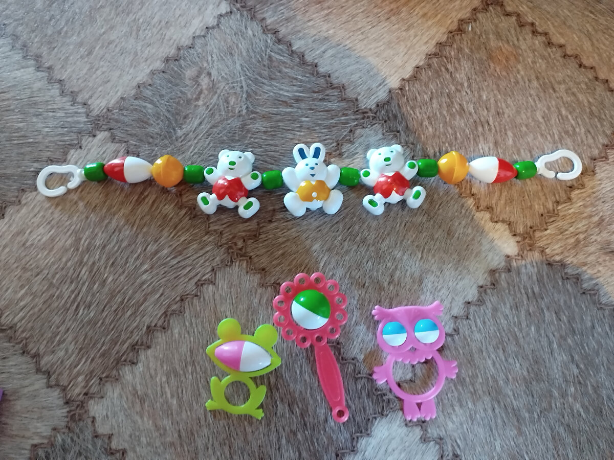 Любаша очень развитая в общем и целом девочка. Может даже где-то опережает своих сверстников на год-полгода точно. Естественно, я с ней занималась. И думаю, мы могли бы достичь еще больше, если бы не проблемы со здоровьем, которые я вынуждена была решать в ущерб времени, проведенному с ребенком. Расскажу об игрушках, которые у нее были до года. А также об игрушке, которой у нее не было и почему. Месяцев с двух, когда появилось время бодрствования, стали заниматься с погремушками. Мне нравились советские. Купила набор из пяти штук, осталось три. На третьем месяце жизни, Люба почему-то начала заваливать голову в одну сторону. И погремушки очень помогли в выправлении. Я выкладывала дочь на живот и звенела погремушкой выше и выше, чтобы дочь тянулась и тренировала мышцы. Также была куплена растяжка на коляску. Она до нее тянулась ручками. Я ее вешала и над кроватью позже. А вот от мобиля я отказалась. Я считаю, что это зло злейшее. Кто до этого додумался??? Крутящаяся фигня над головой. У