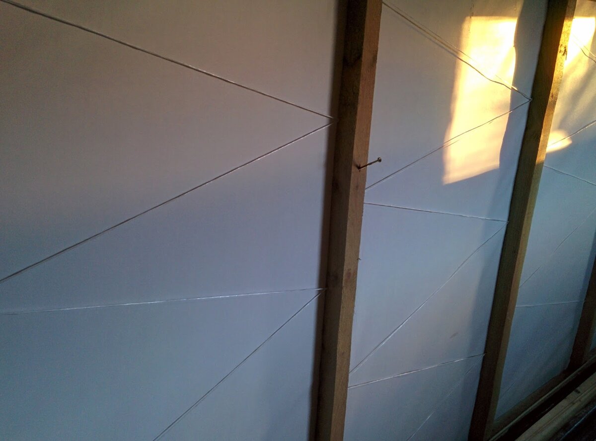 Два месяца назад натянутая на стены мембрана ветро-влагозащиты немного ослабла, и теперь колыхалась на ветру. С тех пор сильно потеплело, и она растянулась. Свою основную функцию она не утратила, но вот маты утеплителя держать уже точно не будет. Да, да, я по своей неопытности и незнанию технологии каркасного домостроения на тот момент был уверен, что это хорошая идея - использовать ветро-влагозащитную мембрану ещё и как ограничитель для утеплителя.