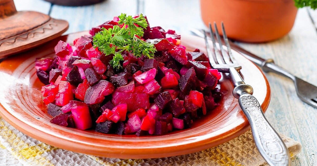 В копилке классических салатов у каждой хозяйки примерно одни и те же закуски. Но в последнее время мы так много экспериментируем, чтобы подарить новый вкус уже знакомым блюдам! Хочется чего-то оригинального, но в то же время проверенного. Так и появляются оливье с тунцом и мимоза с яблоком. А я однажды приготовила винегрет без горошка! Теперь делаю только так, потому что домочадцам очень понравилось. Кроме того, я попробовала запекать овощи для винегрета, а не варить их. Вы удивитесь, как этот простой шаг повлиял на всё блюдо! Вкус закуски стал более ярким, насыщенным. Дело в том, что при запекании все соки и вкус остаются внутри овощей, а не разбавляются водой. Помимо этого, при запекании можно сбрызнуть картошку, морковь и свеклу маслом, натереть любимыми специями. Удобно! Как приготовить винегрет из запеченных овощей без горошка Кстати, многие исследователи кулинарии утверждают, что винегрет обязательно нужно заправлять маслом, смешанным с уксусом. Вы можете поступить так же. Уксус