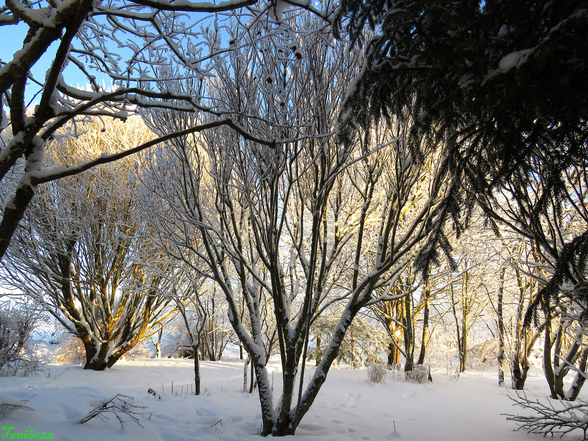 С юга растёт старая ель. А также дом и сарай. И для низкого зимнего солнца это припятствие. Поэтому Сад зимой освещается пятнами. 7 и 21 января были чуть ли не единственными солнечными днями, когда я в придачу была дома. Весь день носилась по Саду. Солнечные пятна ведь передвигаются и новые виды открываются. А 7 января ещё и мороз был -23. Пробегусь пару кругов и домой греться. Через полчаса опять выскакиваю, а за мной кто-нибудь из котов, непонимающих, что происходит. Они меня к дому всё пытались заманить. Только Масяндра в мороз не выходит. Предпочитает нежится дома в тепле после пяти лет тяжёлой жизни на улице. Хвойных у меня мало. Ели, туи, сосны, можжевельники и только две декоративных: ель голубая и туя "Jantar", но она ещё крохотная. Как-то я равнодушна к хвойным. Меня больше интересуют ягоды и плоды в зимнем Саду. Яблоки я специально оставляю для птиц. Яблонь много, всем хватит. Смородину, крыжовник и прочие ягоды я тоже не до конца снимаю для бабочек и других насекомых