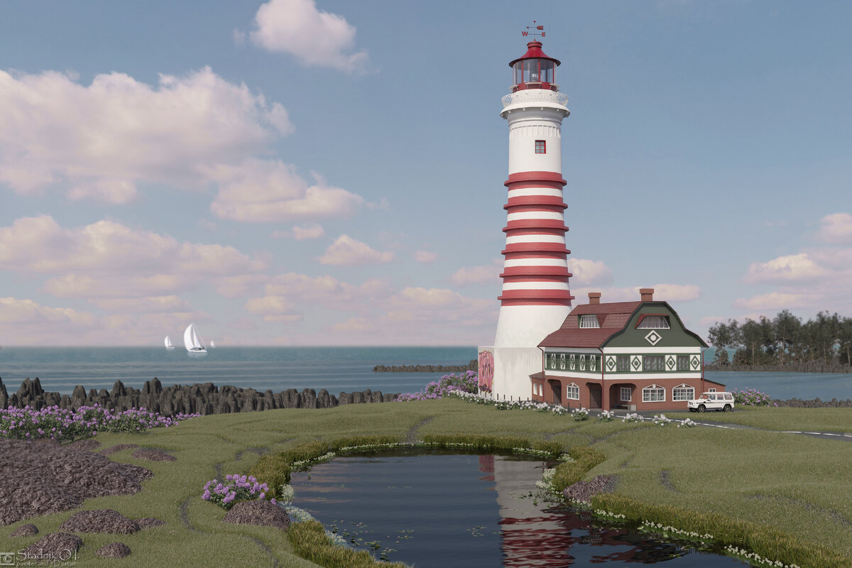 "Маяк на берегу океана. День." "Lighthouse on the ocean. Day." 海洋上的灯塔。 一天 3Ds Max, Corona render, Photoshop