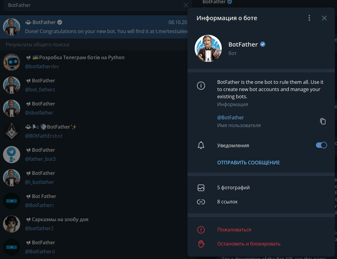 Основная цель бота: Собрать контактную информацию от наших клиентов и снять нагрузку с менеджера по часто задаваемым вопросам Менеджер не будет тратить время на выявление основной информации, т.к. бот сделал за него часть работы. Таким образом, ваш отдел продаж сможет обрабатывать больше заявок и работать над основными возражениями. Если вы не смогли продать услугу своим клиентам, то у вас есть его телефон и его аккаунт. Вы можете делать рассылку своего рекламного предложения по базе подписчиков и сразу позвонить всем, кто откликнется. Таким образом, вы платите только один раз за привлечение подписчика, а дальше можете работать с ним бесплатно через рассылки и бота. Бот делаем по нише «Праздники» Приступим к созданию первого бота в Telegram. Взаимодействие с BotFather осуществляется при помощи простых команд. Например, для того, чтобы зарегистрировать нового бота, достаточно отправить к нему в чат команду /newbot и следовать простым инструкциям: Снизу пошаговый пример создания бота. На