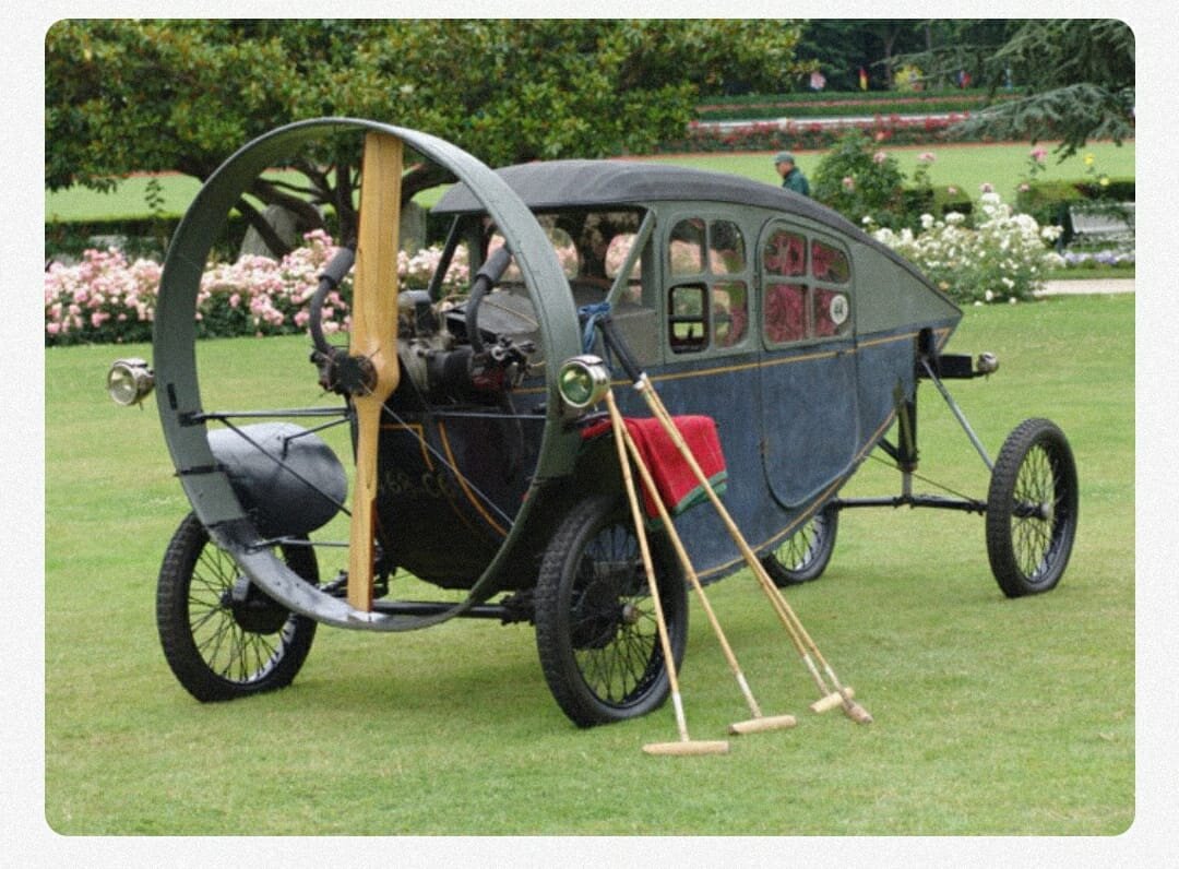 На фото Рено Хелика. Я очень люблю передачу Гранд Тур, три очень богатых господина Кларксон, Мэй и Хаммонд, попав в "рабство" к Амазону занимаются всякой ерундой по всему миру. Правда этой ерундой они иногда занимаются на Бентли в Реюньоне, или на Феррари во Флоренции. В одной из последних серий их послали во Францию, выяснить про французский автопром и самих жителей это прекрасной страны. Французский автопром ужасен, тут я согласна с ведущими передачи. Производимые машины отвратительны что внешне, что изнутри (знакомый автомеханик впадает в истерику при упоминании ситроэнов, Рено и прочего). На фото один из таких "шедевров" Рено Хелика. Создан французским авиатором Марселем Лейятом. Передвигается машина при помощи полутораметрового пропеллера. Машина была "супер удачной"! Она поворачивала не туда, регулярно переворачивалась, часто не заводилась. А знаете как она заводится? Один человек сидит внутри и дёргает рычажок, а второй снаружи дёргает трос. То есть как бы машина для двоих и