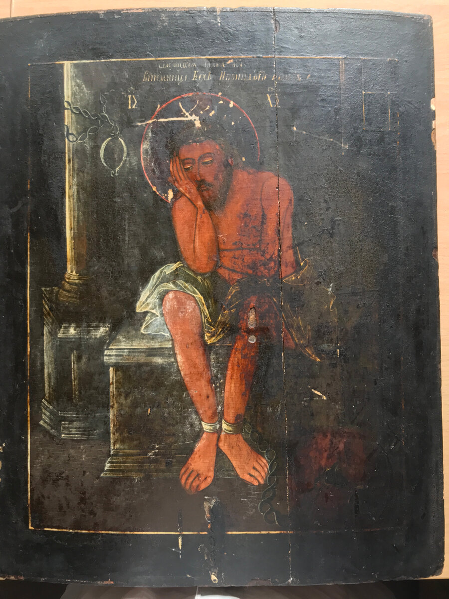 ещё одна отреставрированная икона, сюжет нечастый для наших палестин. Возилась по обыкновению долго - состояние иконы не критическое, но технология странноватая, с особенностями хранения к тому ж. Снимала совсем в полевых условиях - понятно только (надеюсь), что попала икона ко мне под совсем тёмным слоем, с едва различимыми контурами фигуры (это видно справа). Бывает это - восемь случаев из десяти - от регулярного _протирания_ с целью улучшить яркость, сочность, настоящесть, что там ещё люди хотят - поверхности иконы растительными пищевыми маслами. Окислилось всё, что могло. Снимала эти труды незнаек-самоделкиных несколько недель, сберегая авторские слои живописи. Дело осложнено крайне неравномерным грубоватым рельефом, поздними чинками и поправками - нимб вон царапали и золотили самоварным золотом, каллиграфию поправляли. Икона открылась постепенно; она писем простецких, с трогательными деталями - тяжёлое ядро с цепью у ноги узника, мраморные столб и ложе, высокое окошко