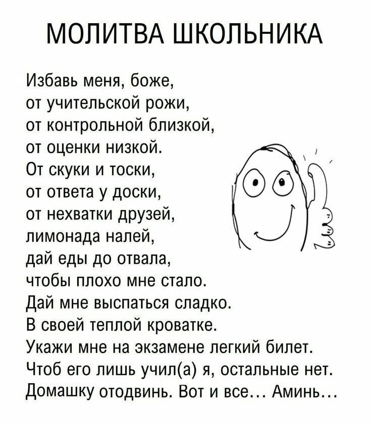 Вот интересно, а школьники вообще любят своих учителей? А ещё о чем они говорят" с глазу на глаз", когда нет учителей? Я тут случайно заглянула на страничку одной из учениц и увидала на ее стенке вот такую школьную "молитву". Нет, ну она во многом шуточная! Во всяком случае, мне, как педагогу, хотелось бы с этим согласиться. Но с другой стороны, а если их и в самом деле раздражает наша "учительская рожа", и они где-то в своих кампаниях потом , после уроков "перемалывают нам косточки", то немного грустно. К тому же, получается, мы стараемся во всю, а им на наших уроках скучно и тоскливо?! Но мы же-не клоуны и преподносим им не клоунские основы, а весьма важные дисциплины?!!! Хотя, если мы-мастера на все руки, то что нам стоит объединиться и написать свою молитву для защиты себя, то есть учительскую???? Хотя вот в сетях интернета я нашла и публикую для всех вас с их позволения: Очень сильная молитва педагога на весь круглый год! Спаси меня, школьного работника, от ребёнка нерадивого, р