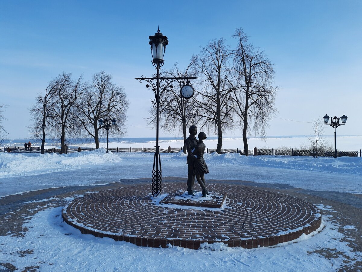 Всем привет! Как я уже рассказывал, мы с группой товарищей решили воспользоваться длинными выходными, и отправились в небольшое путешествие. Первый день – 23 февраля – провели в Ульяновске. Надо признаться, что я был в этом славном городе дважды, но оба раза – строго в деловых поездках. В итоге с городом я абсолютно не был знаком. Поэтому все, что я увидел сегодня, для меня в новинку. И начну я серию публикаций об Ульяновске с рассказа о скульптурной композиции, которая мне особенно приглянулась. В разных источниках ее называют по-разному. Либо «Памятник влюбленным», либо «Свидание». И то, и другое, на мой взгляд, подходит. Находится этот объект на бульваре Новый Венец. Это пешеходная зона, где, как нам рассказали, всегда много отдыхающих. Когда мы приехали в Ульяновск, погода особо не располагала к прогулкам. Было хоть и солнечно, но морозно – минус 17 градусов. Наверное, по этой причине на всем бульваре Новый Венец мы встретили лишь две пары праздно болтающихся граждан, одного турист