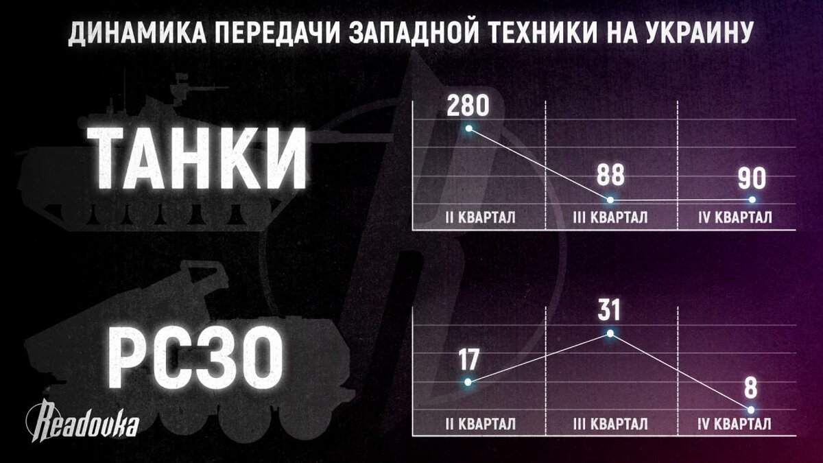 Чем дальше, тем меньше масштаб поставок. Американские ресурсы на поддержку ВСУ не безграничны, в какой-то момент они иссякнут – так в последние дни характеризуют атмосферу в администрации президента США Джозефа Байдена источники западных СМИ. Анализ Кильского института мировой экономики подтверждает тезис об исчерпании у Запада запасов вооружений. С первых дней СВО США и их союзники осуществляют передачу больших объемов наступательной военной техники Киеву. Правда с каждым следующим месяцем объем передаваемой Украине тяжелой техники сокращался. Если с апреля по июнь 2022 была анонсирована передача 280 танков, то с октября по декабрь показатель снизился до 90 машин. Схожая ситуация с гаубицами калибра 155-мм и 152-мм, а также с РСЗО. При этом Abrams, Leopard 2 и Challenger еще не добрались до Украины, но уже очевидно, что их количество будет ограниченным. В частности, в ближайшие месяцы Украине будут переданы 47 Leopard 2 вместо обещанных 62 при номинальных запасах в сотни машин. Это