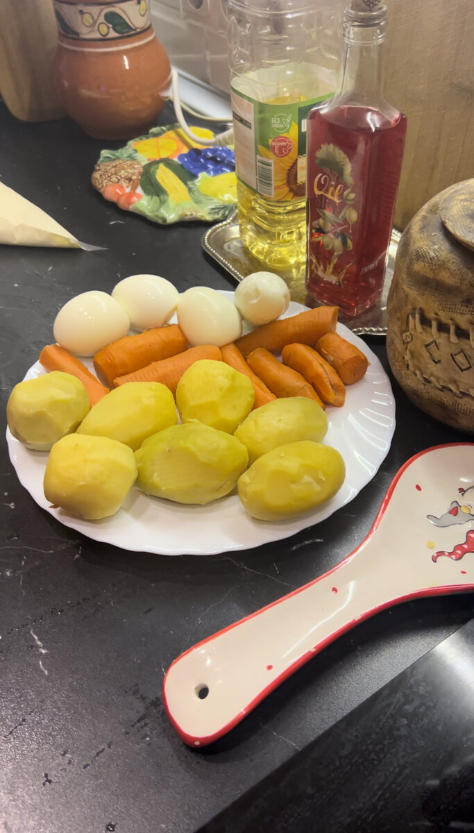 Куриные окорочка( именно окорочка, а не другое мясо, это обязательное условие), яйца, морковь, картошку сварить.