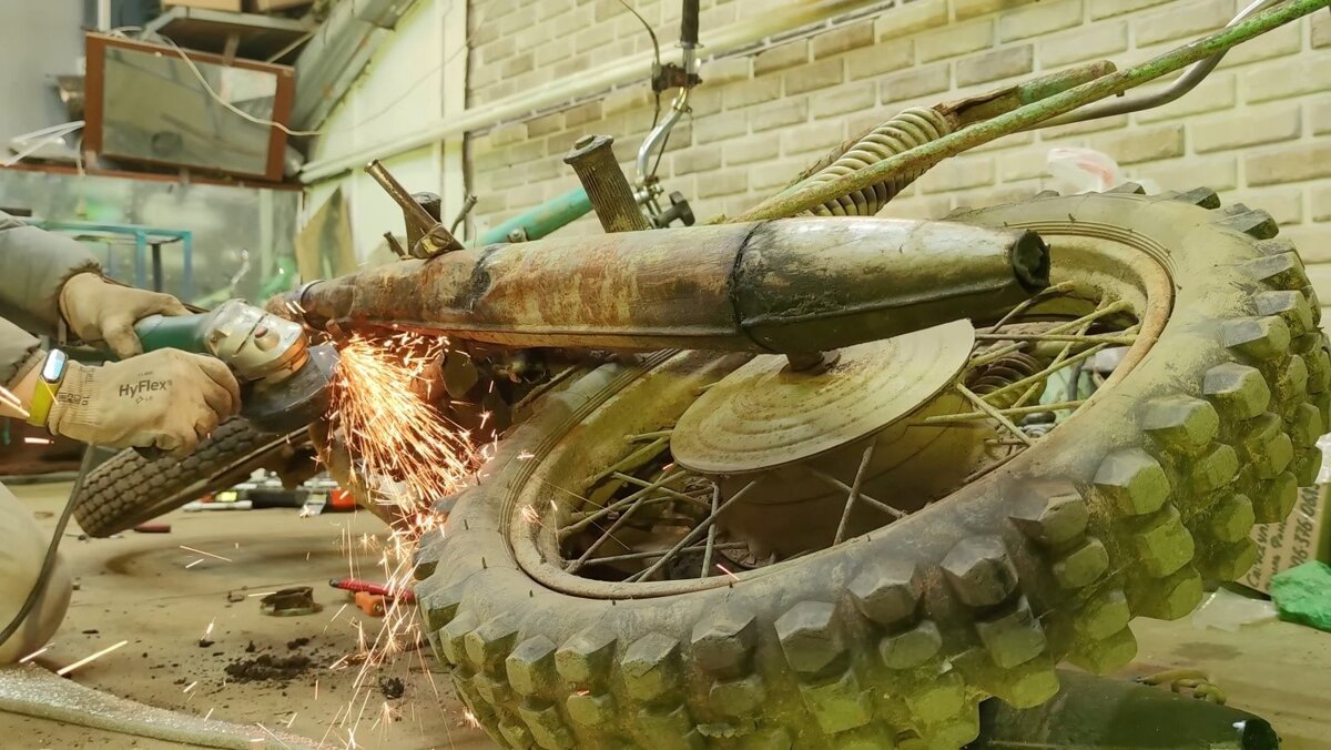 Однажды в лесу автор нашел старинный ИЖ-56, заросший травой и заваленный ветками. Этот мотоцикл уже доживал свой век, и его предыдущий хозяин решил упокоить его душу прямо на месте. Но любитель восстановления старой техники решил не оставлять его на произвол судьбы и забрал его в свою мастерскую. После беглого осмотра автор столкнулся с ржавыми болтами, изорванным сиденьем, сломанным рукояткой ручного тормоза, заржавевшими глушителем и баком, лопнувшим рычагом переключения передач и болтающейся рукояткой стартера. Но мотоцикл все еще был жив, и его колеса крутились, поэтому он был вытащен из леса и доставлен в мастерскую. Разобрав мотоцикл на части, автор начал тяжелую работу по очистке и восстановлению. Он удалил всю лишнюю проводку и снял все навесные элементы, а затем взялся за срезание глушителя и приржавевших подножек с помощью болгарки. Некоторые части мотоцикла легко откручивались, а другие приходилось вынимать молотком и зубилом. Однако, когда автор добрался до цепи и картера,