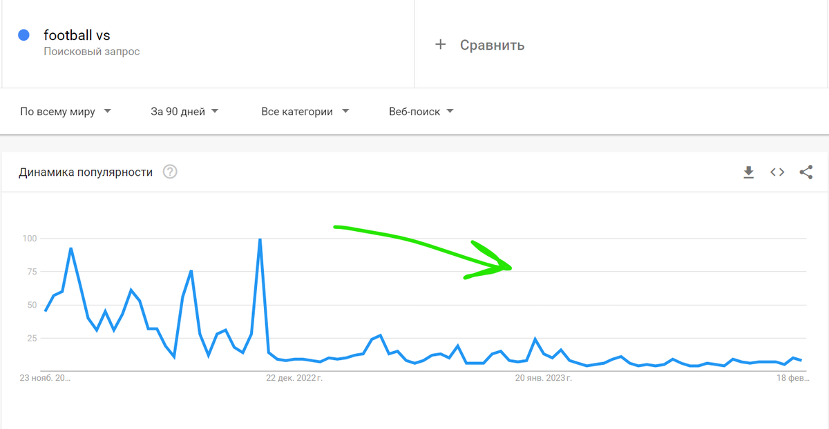 Я сейчас хочу взять в пример нишу Football VS. На данный момент статьи сегодня 23 февраля. Давайте зайдем в гугл трендс и посмотрим что он нам покажет.