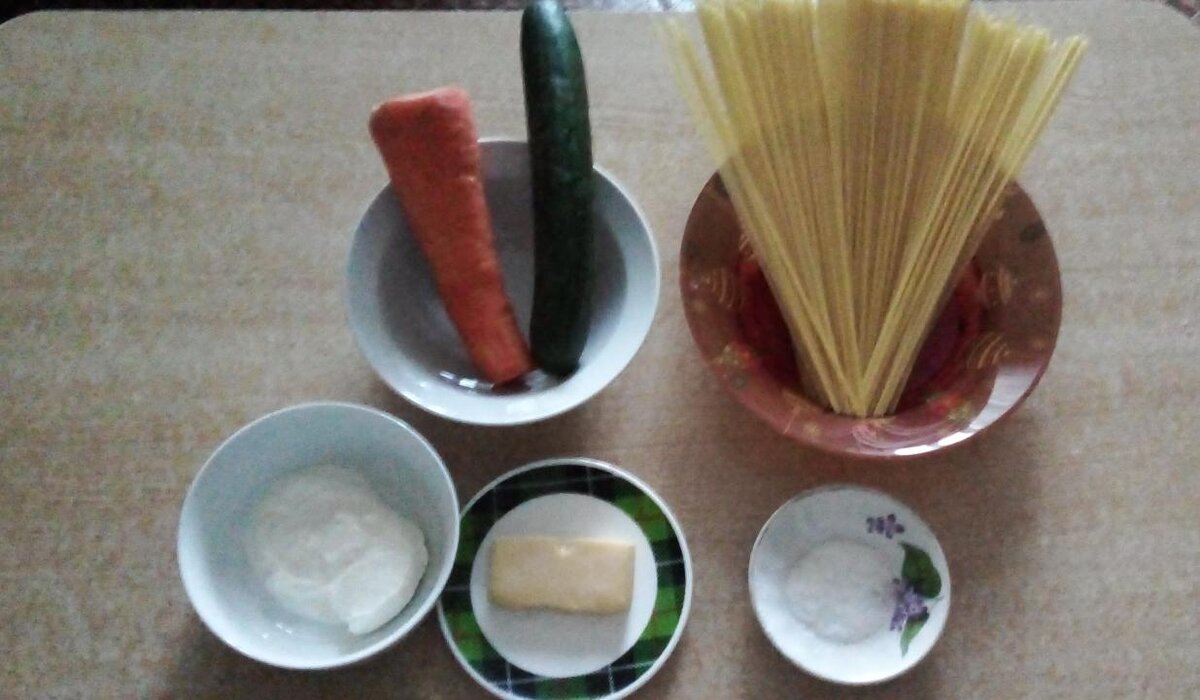 Продукты: 200 гр спагетти, 1 морковь, 1 огурец, 50 гр твердого сыра, 1 ст. л. сметаны, соль.