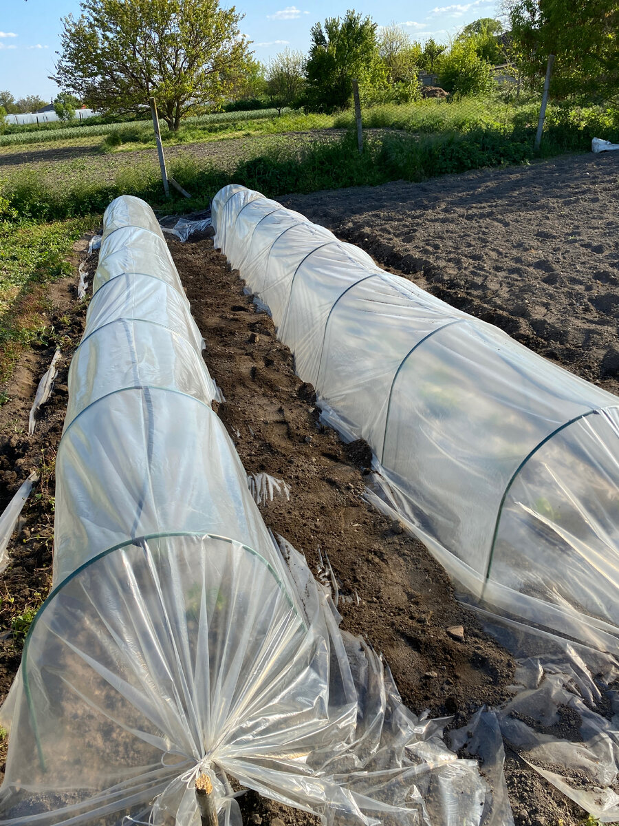 В прошлом году мы с семьей решили, что сажать помидоры в открытом грунте не очень эффективно. Мы живем в Крыму. Хоть и имеется качественная система полива, растения все равно горят под солнцем еще на этапе цветения . Строить полноценную телицу долго и дорого. Также огород используется для выращивания различных культур, поэтому не хотелось занимать большой участок теплицей. Отличной идеей оказались мини теплицы . Ставятся они довольно просто и быстро. Вдвоем мы поставили за несколько часов, сразу высадив помидоры . Для таких телиц нужны специальные дуги. Их можно приобрести готовые или сделать самостоятельно из подручных средств . Мы брали готовые в магазине «Доброцен». Также нужна пленка, которая стелится на землю, чтобы не росли сорняки. Для растений в ней делаются небольшие прорези . Полив капельный, кладется под пленку. Растения мы располагали в шахматном порядке. Уже в конце мы натянули пленку поверх дуг. Кстати, для лучшего эффекта лучше использовать агроволокно, оно защищает